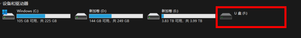 有的时候我们在电脑中发现有一个盘通常是没有使用的状态,这个U盘(F:)就是插入的拓展坞的盘,看起来比较碍事,想隐藏它。