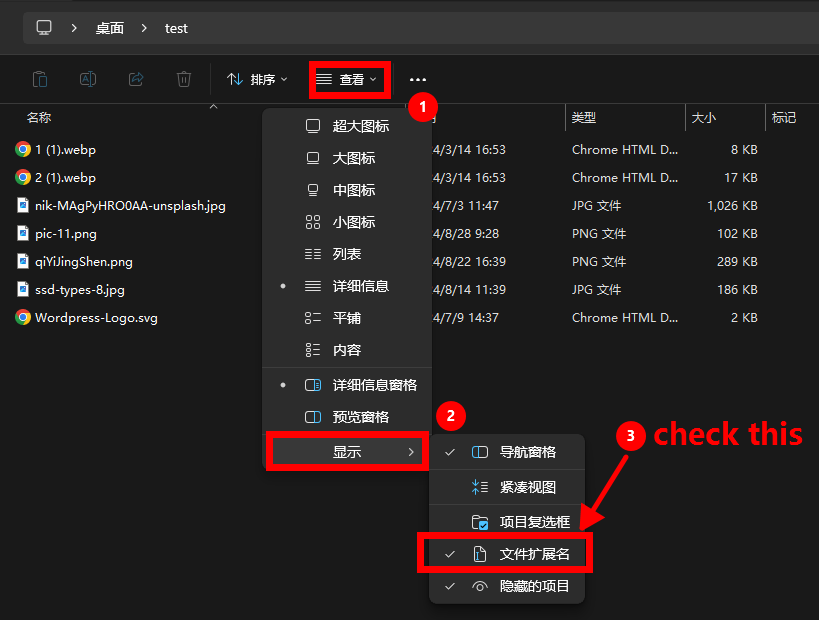 首先,需要确保文件资源管理器中“显示文件扩展名”。打开“文件资源管理器”,点击“查看”菜单,选择“显示”,然后勾选“文件扩展名”。这样,文件名后缀的扩展名将会显示出来。