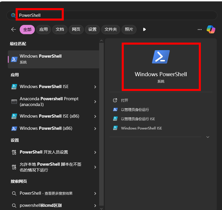 按Windows + S打开搜索框,输入“PowerShell”,然后点击“Windows PowerShell”以打开。