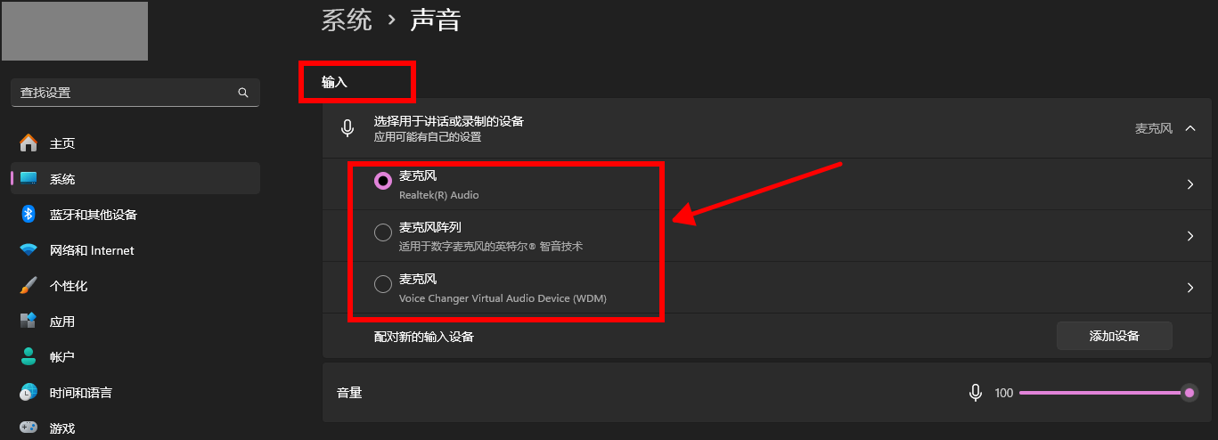 在输入部分,查看是否有可用的麦克风设备。如果没有显示设备,同样点击添加设备。