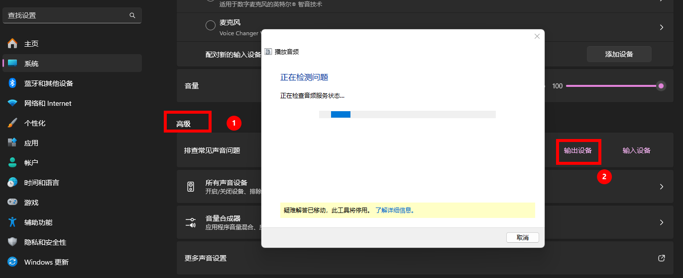 在声音设置页面,向下滚动到高级部分,点击输入和输出设备的故障排除。