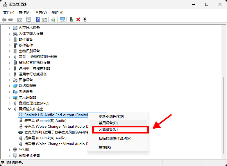 展开音频输入和输出,右键点击你的输出或输入设备(如扬声器或麦克风),选择更新驱动程序。