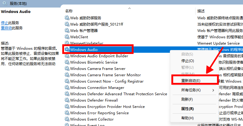 在服务列表中找到Windows Audio,右键点击选择重新启动。