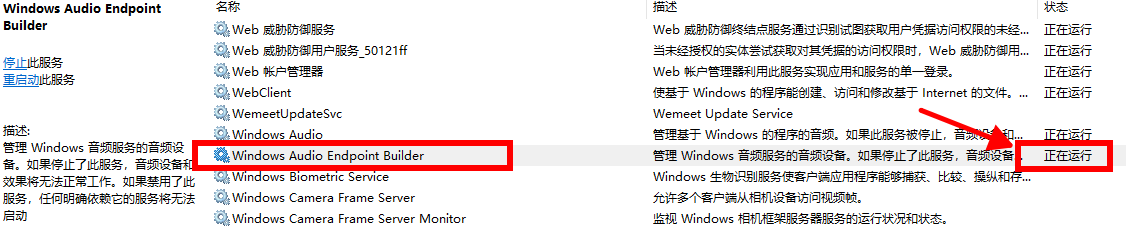 还要检查Windows Audio Endpoint Builder服务是否正在运行,确保它处于启动状态。