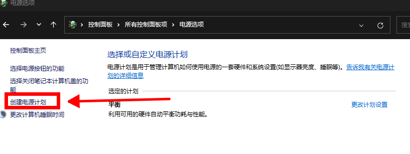 在电源选项窗口中,点击左侧菜单的“创建电源计划”