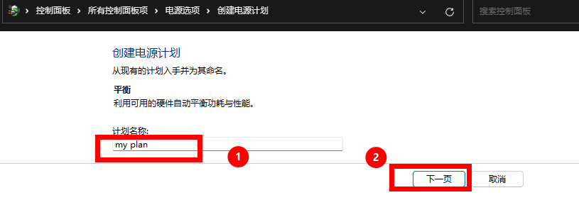选择一个基础电源计划(例如“平衡”或“节能”),然后为新计划命名