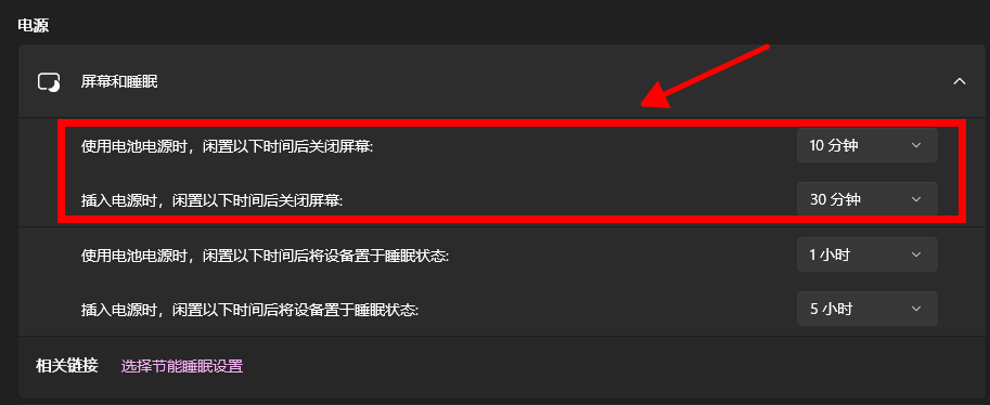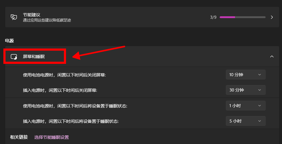 在电源和睡眠设置页面,可以看到“屏幕”和“睡眠”两个部分。