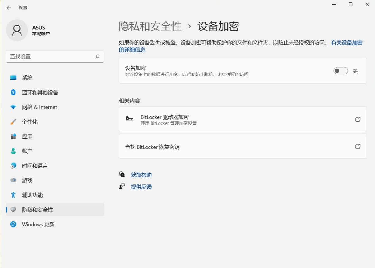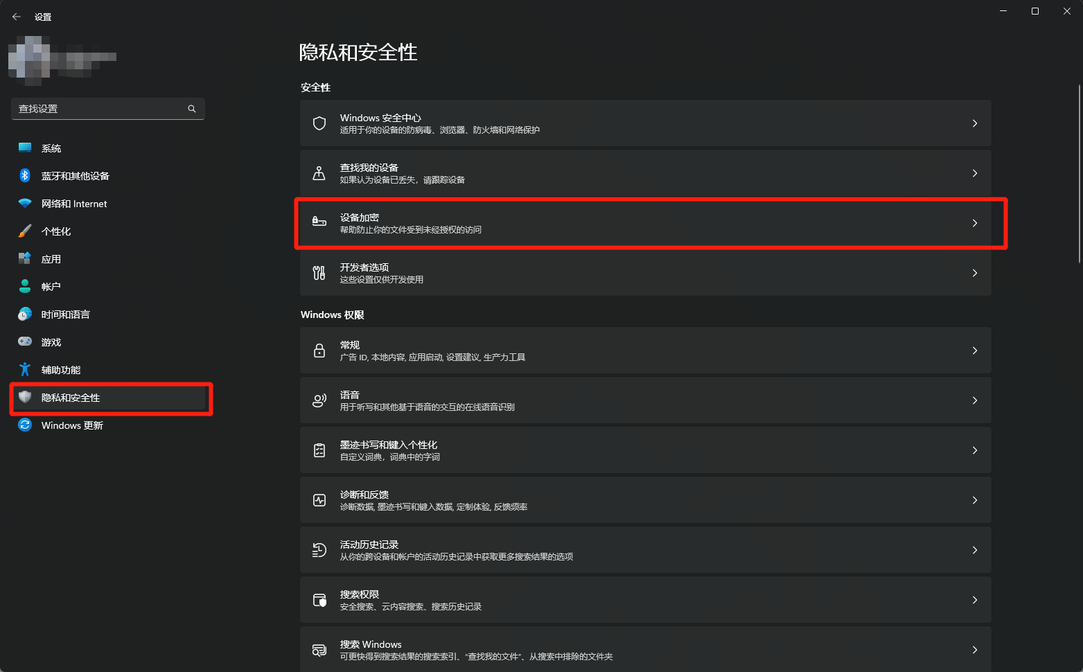 打开设置(win+I) >> “隐私和安全性” >> “设备加密”